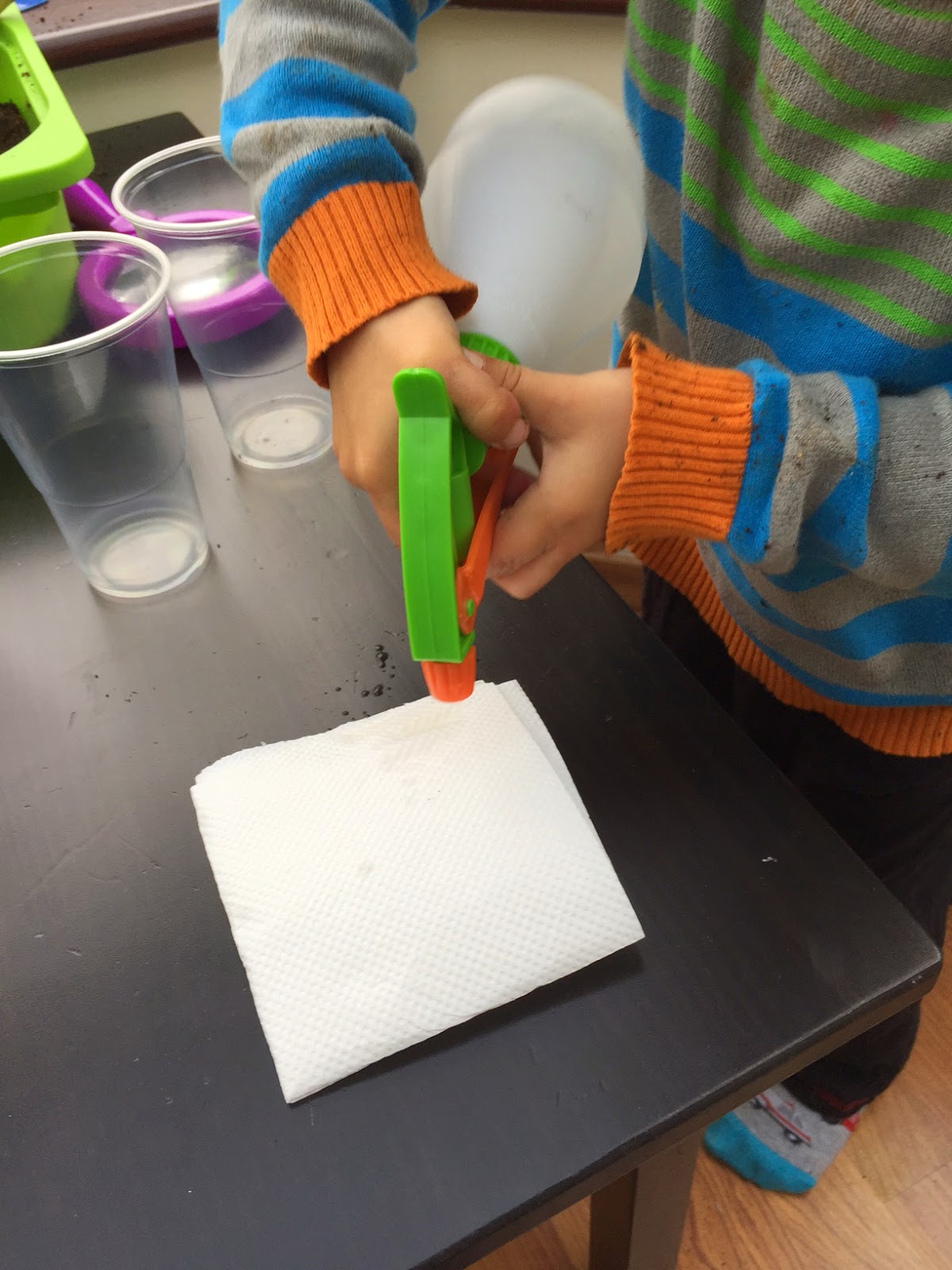 Once the seeds had been sorted, I set up another tray to help him plant the seeds into some clear cups. I chose clear cups so that we could observe the root system beneath the plant once it started to grow.